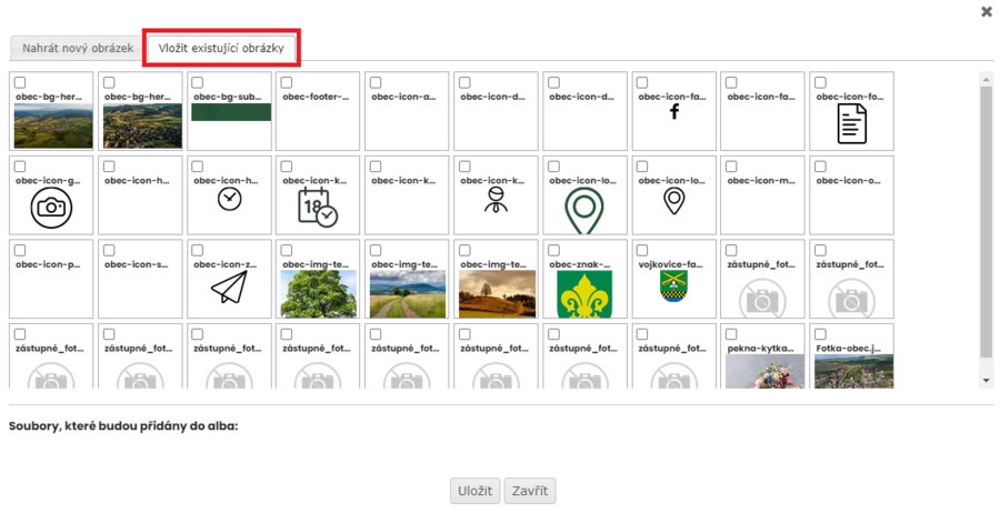 Na webové stránky můžete vložit i již existující obrázky, které byly na webové stránky nahrány již v minulosti.