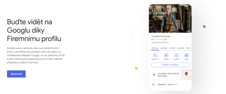 - Klikněte na stránku google.com/business, přihlaste se ke Google účtu. Klikněte na „Spravovat“.