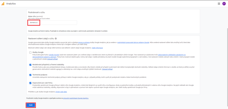 2. Zobrazí se Podrobnosti o účtu, zde do pole Název účtu napište svojí doménu bez https a www. Následně klikněte na konci stránky na tlačítko Další.