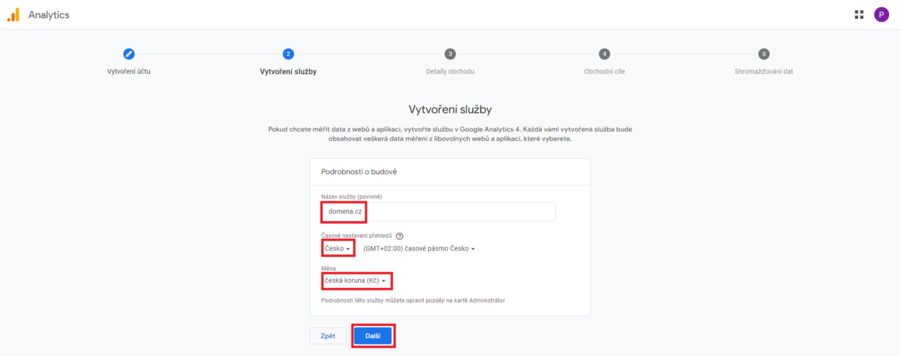 3. V Detailu obchodu do Názvu služby napište svojí doménu bez https a www. Nastavte Časové pásmo na Česko a Měnu na českou korunu. Později tyto údaje nejdou změnit! Klikněte na tlačítko Další.