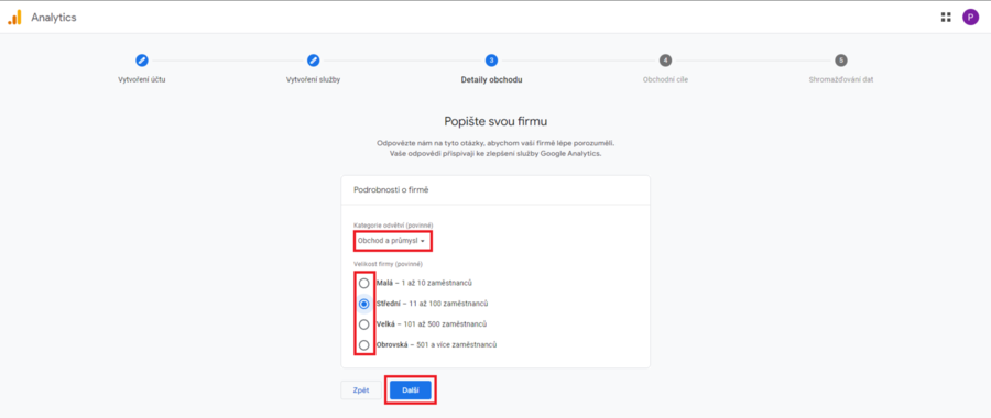 4. Popište svojí firmu - vyberte Kategorii odvětví, zvolte Velikost firmy a následně klikněte na tlačítko Další.