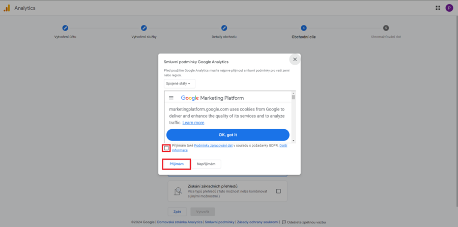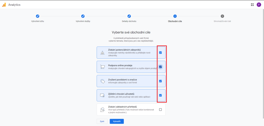 5. Vyberte své obchodní cíle a následně klikněte na tlačítko Vytvořit.