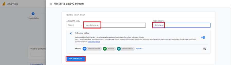 8. V dalším kroku se vám otevře Nastavte datový stream, zde dopíšete url adresu webu, tedy www.vasedomena.cz a Název streamu - vasedomena.cz. Následně kliknete na tlačítko Vytvořit stream.
