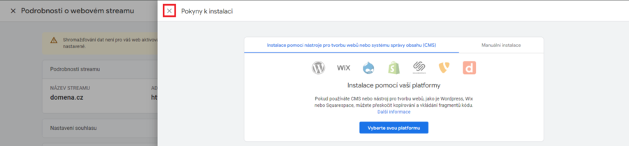 9. Po vytvoření se vám otevřou Pokyny k instalaci, tuto informaci můžete zavřít křížkem v levém rohu zhruba uprostřed horní části obrazovky. Dále se zobrazí Podrobnosti o webovém streamu, tuto informaci můžete také zavřít.