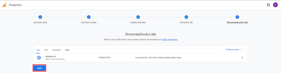 10. Poté vám na obrazovce zůstane Shromaždování dat, kde uvidíte vytvořený Stream. Kliknete na tlačítko Další.