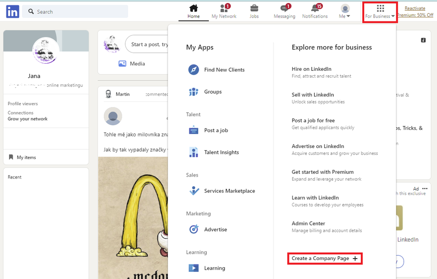 Vytvořte si nejprve soukromý účet na stránce cz.linkedin.com. Přihlásit se můžete i prostřednictvím Google účtu. V hlavním menu vyberte záložku „Pro podnik“ a úplně dole klikněte na „Vytvořit stránku společnosti“.