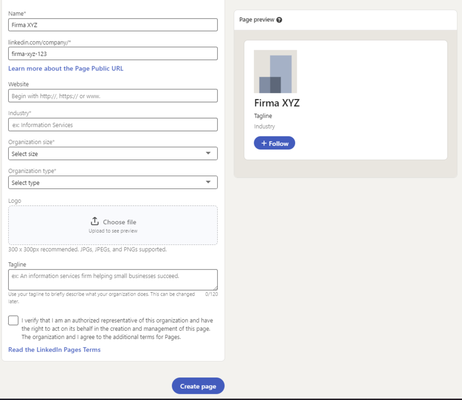 Doplňte informace do společnosti a klikněte na „Create page“.