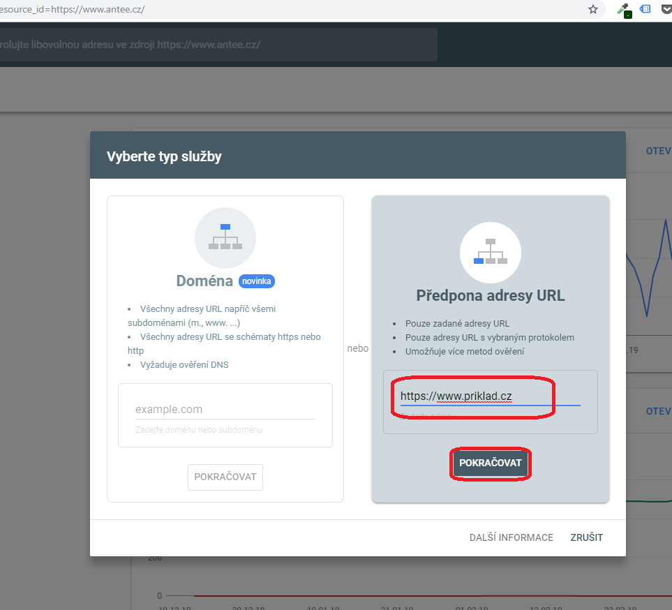 2. V okně „Předpona adresy URL“ do kolonky pro adresu zkopírujte URL webu, který chcete přidat. Adresa musí obsahovat také protokol (http či https). V ideálním případě můžete postupně zaregistrovat všechny verze webu - tedy např. http://priklad.cz, https://priklad.cz, http://www.priklad.cz a https://www.priklad.cz. V zásadě ale stačí, pokud zaregistrujete tu hlavní, na kterou jsou ostatní verze přesměrovány (v případě webu ANTEE je to https://www.antee.cz). Klikněte na tlačítko „POKRAČOVAT“.