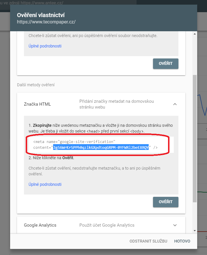 4. Tento kód zkopírujte a pošlete na Helpdesk ipo@antee.cz, kde vám kód do stránky vložíme. Případně kontaktujte svého poskytovatele webu. Po potvrzení vložení kódu do stránek se vraťte do Search Console.