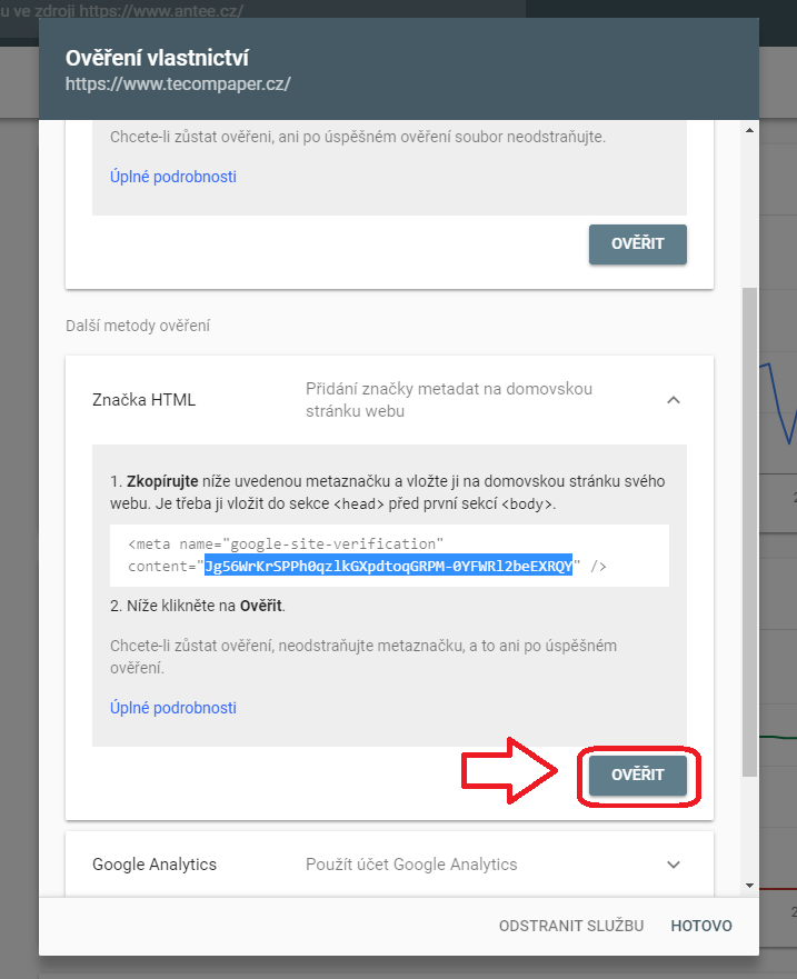 5. Klikněte na tlačítko „OVĚŘIT“ na stránce Search Console.
