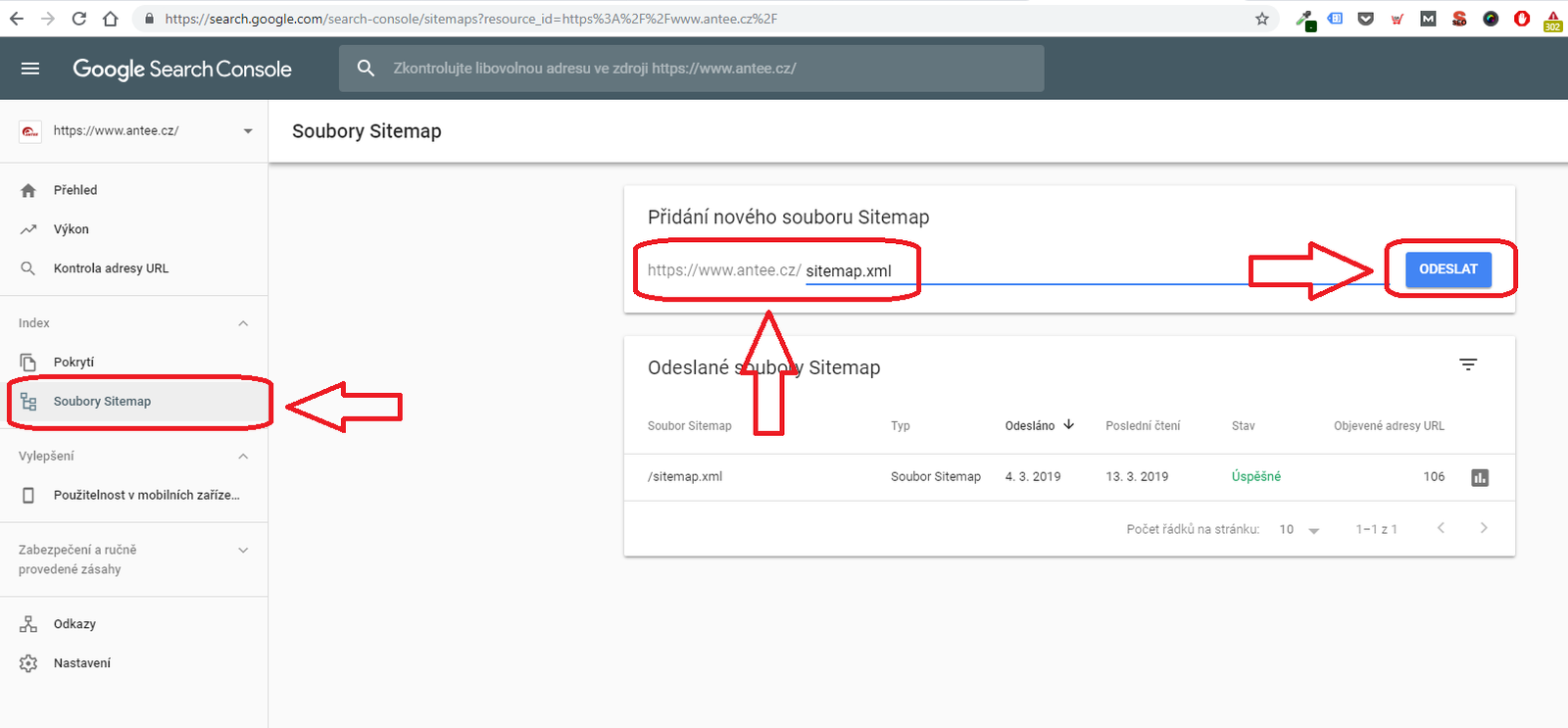 6. V levém panelu (který se zobrazí, když prokliknete ověřený web) klikněte na „Soubory Sitemap“. Do kolonky „Přidání nového souboru Sitemap“ vepište pouze „sitemap.xml“ a klikněte na modré tlačítko „Odeslat“.