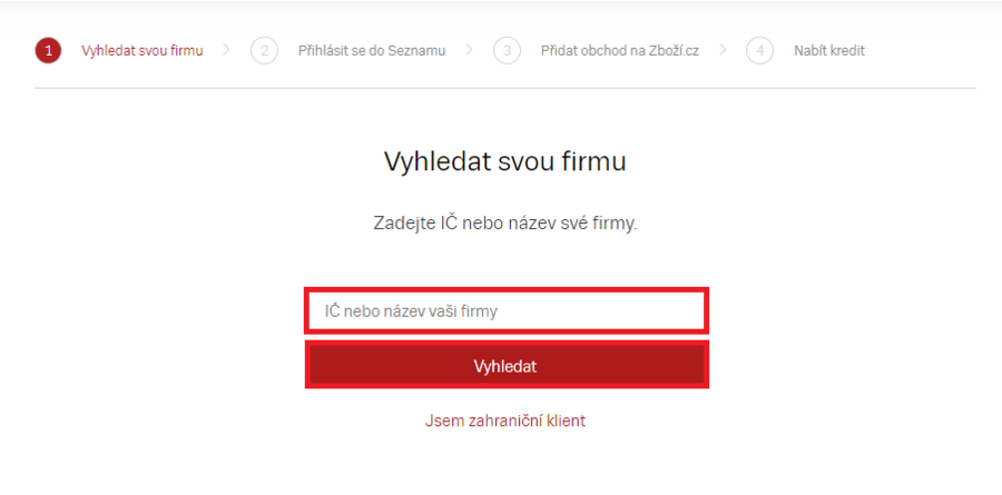 Otevře se Vám čtyř krokové nastavení. Jako první vyhledejte svou firmu pomocí IČ. Vyplníte své IČ a kliknete na vyhledat.