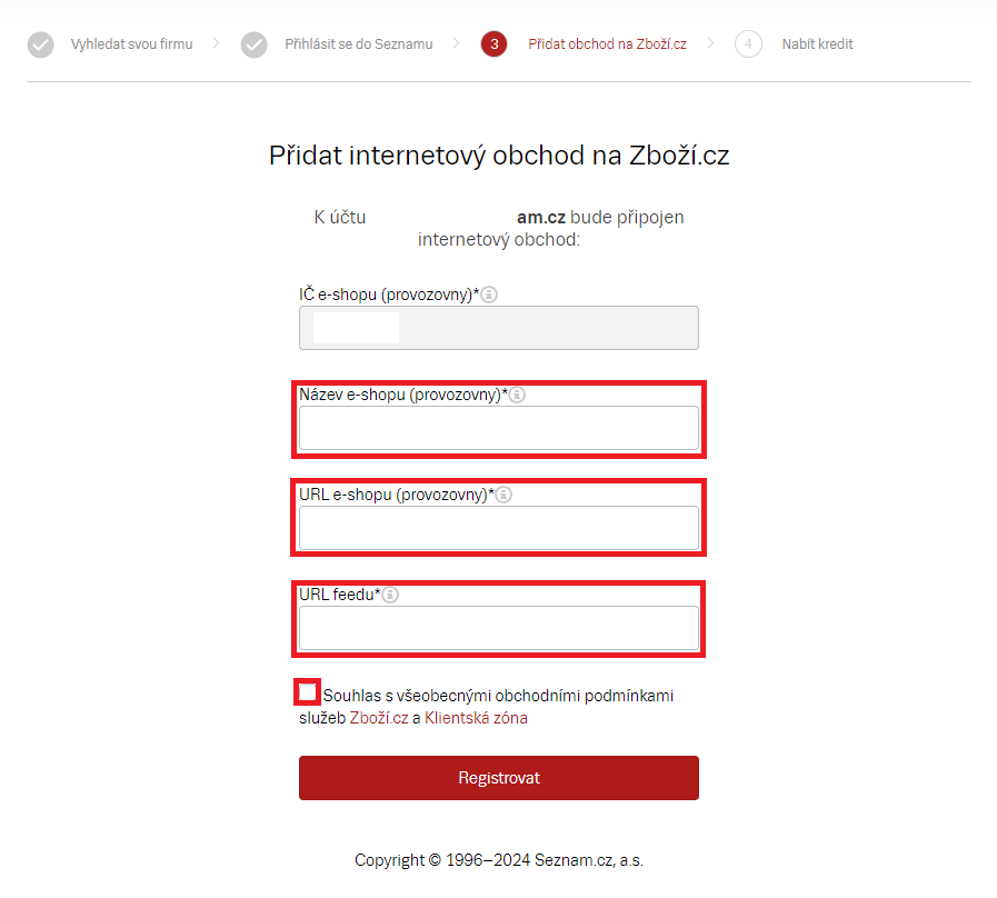 Následně se přihlásíte pod svým e-mailem (může být stejný i pro Google Ads, GA4, ... gmail stačí na Seznamu registrovat). Ve třetím kroku doplníte informace o e-shopu. Odsouhlasíte Všeobecné podmínky a kliknete na Registrovat.